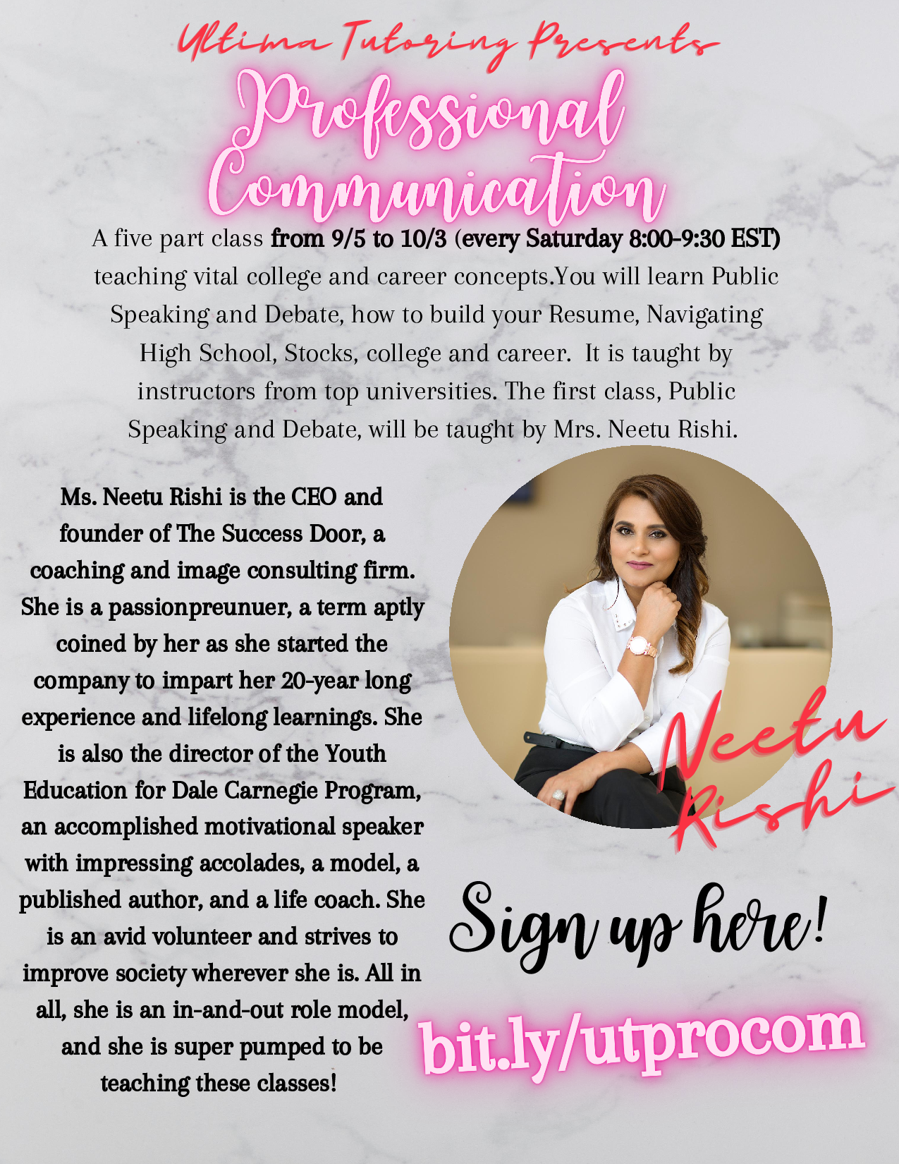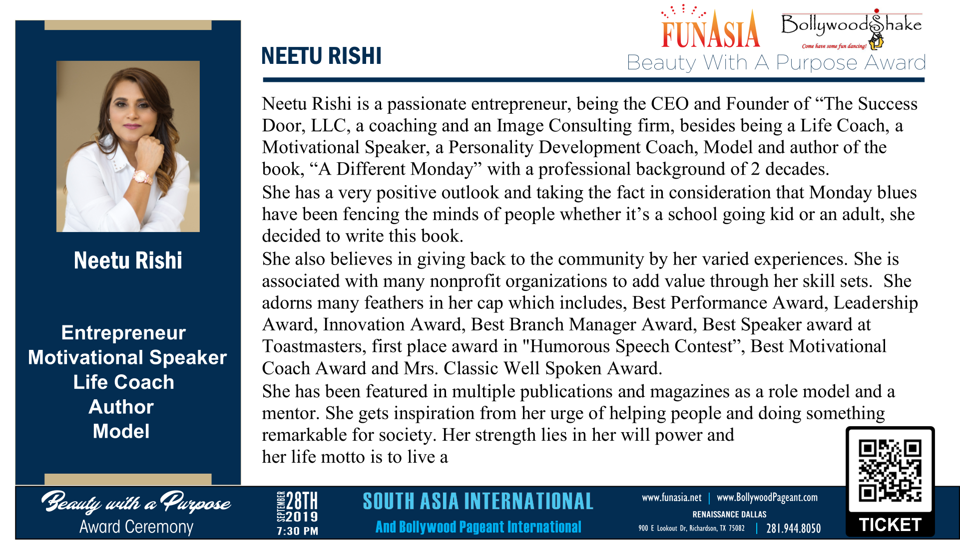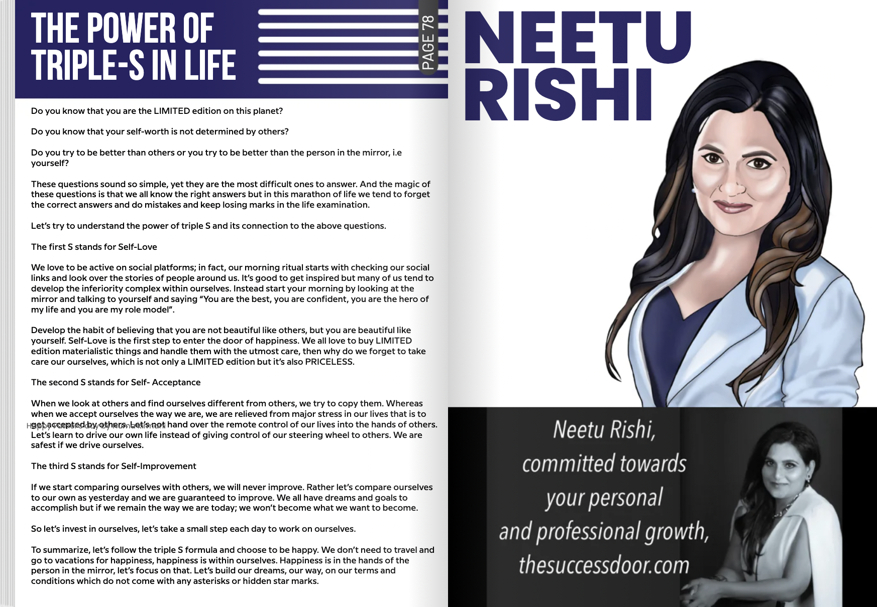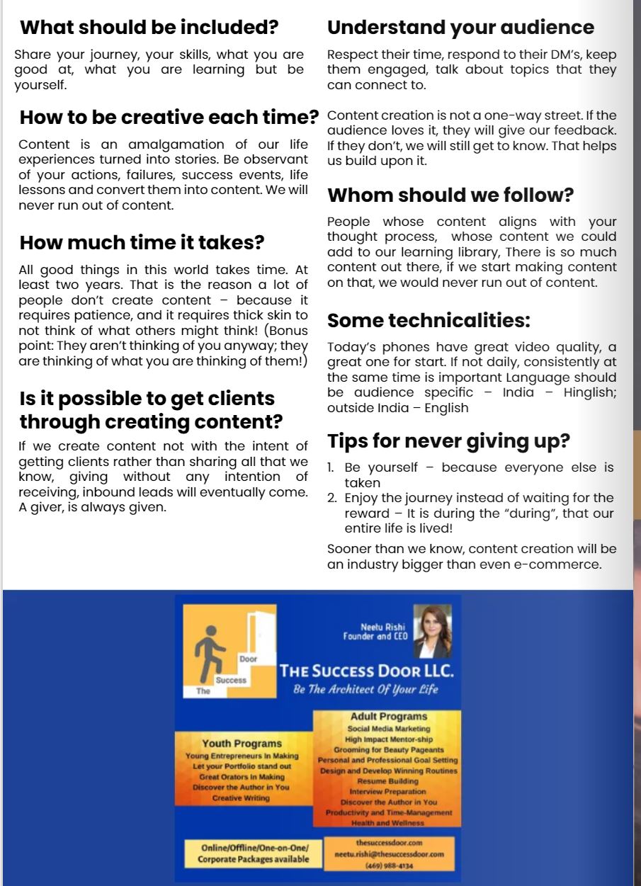 Neetu Rishi is a visionary Personal Growth Mentor, Business & Transformation Coach, and two-time published author. She is the CEO & Founder of The Success Door, a platform dedicated to unlocking human potential through innovative and impactful programs. Under her leadership, The Success Door has been recognized with prestigious honors, including the Excellence in Education Award, the Frisco Best Business Award, and the Outstanding Community Leadership Award.
